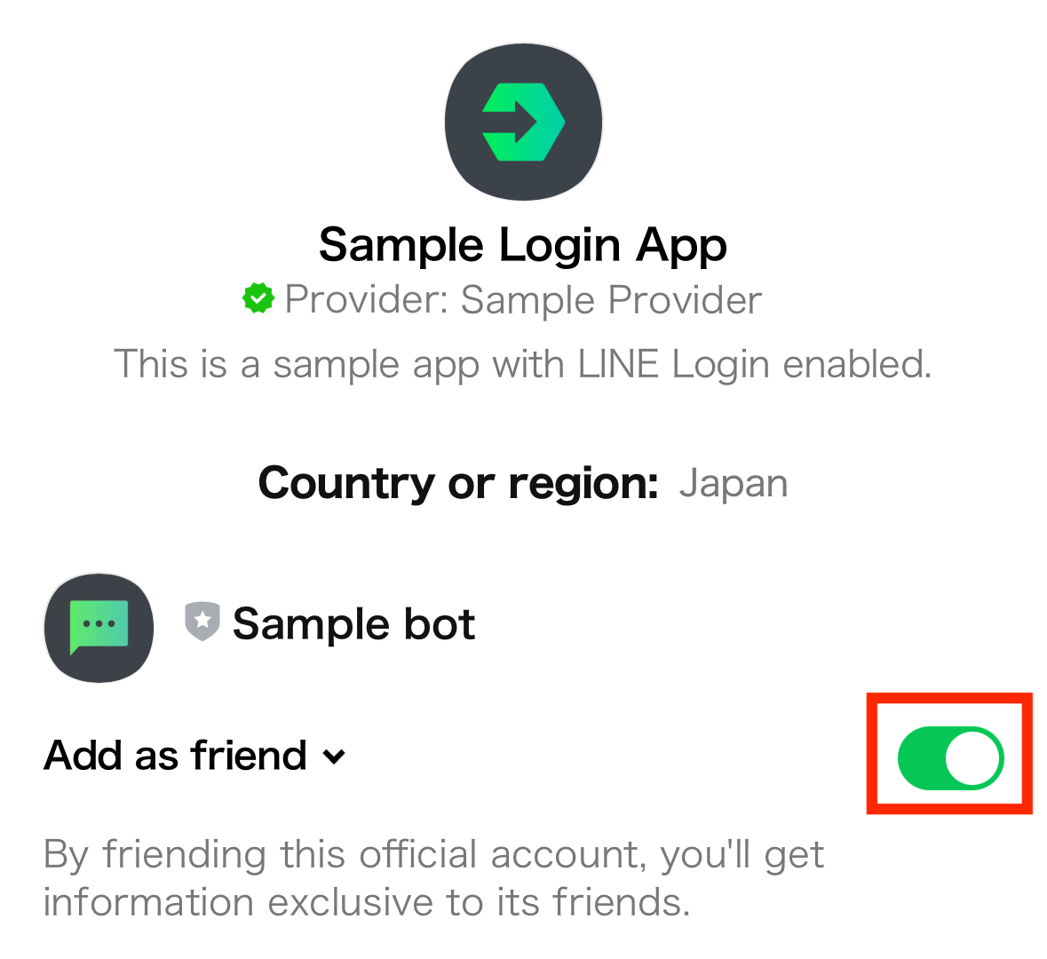 You can display an option to add the LINE Official Account as a friend when a user logs in to your app. This is called the add friend option. Specify the LINE Official Account to be added as a friend on the LINE Developers Console.