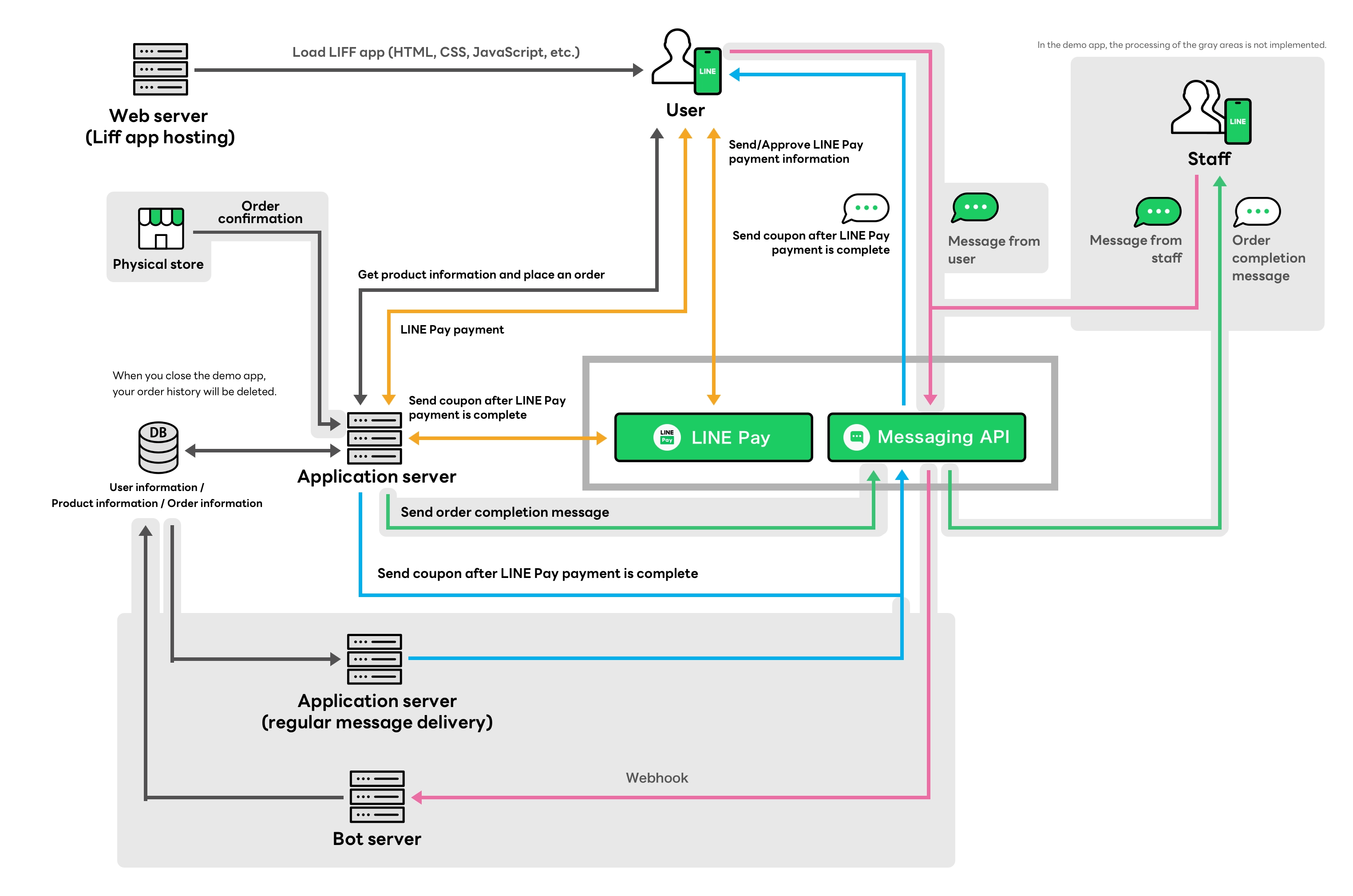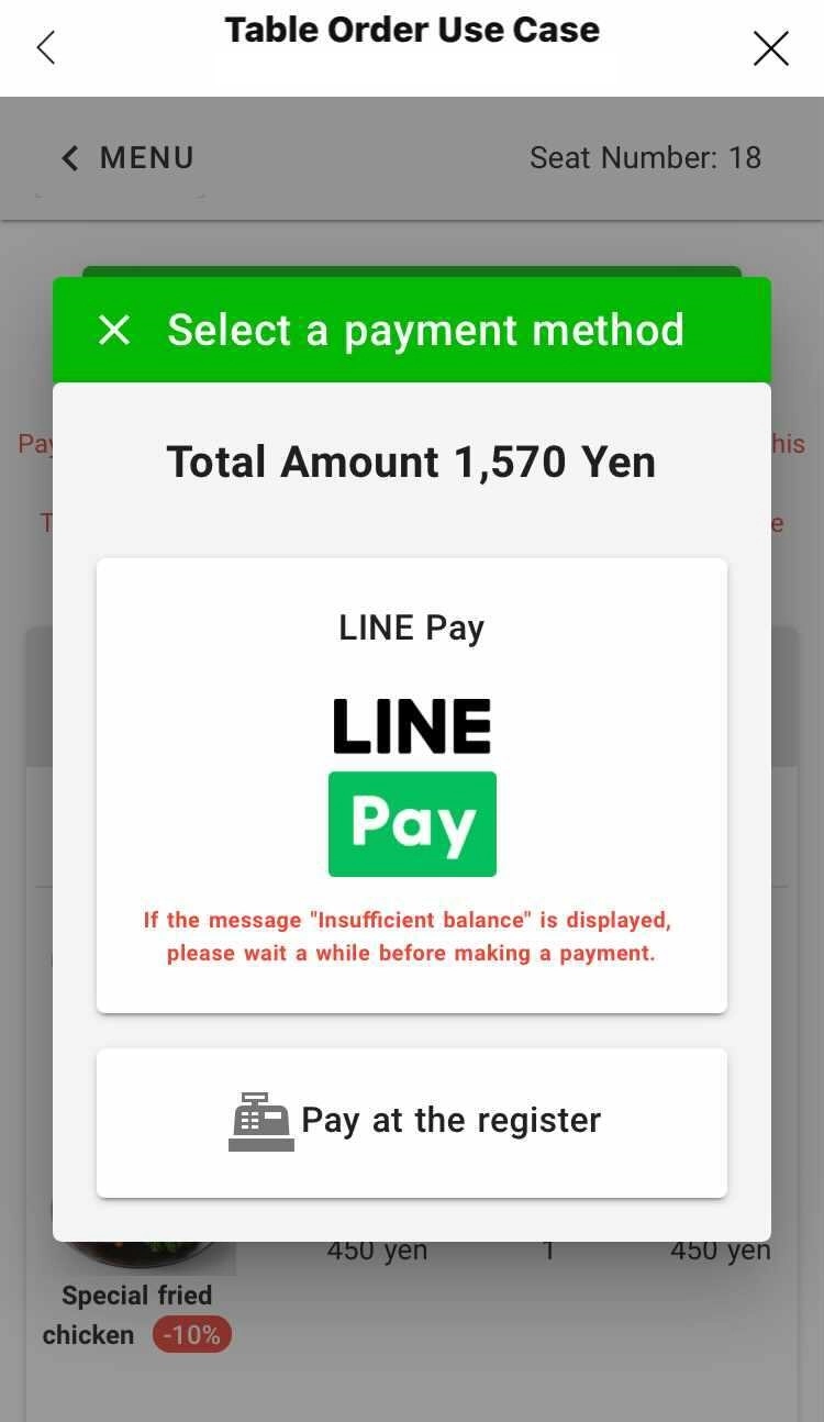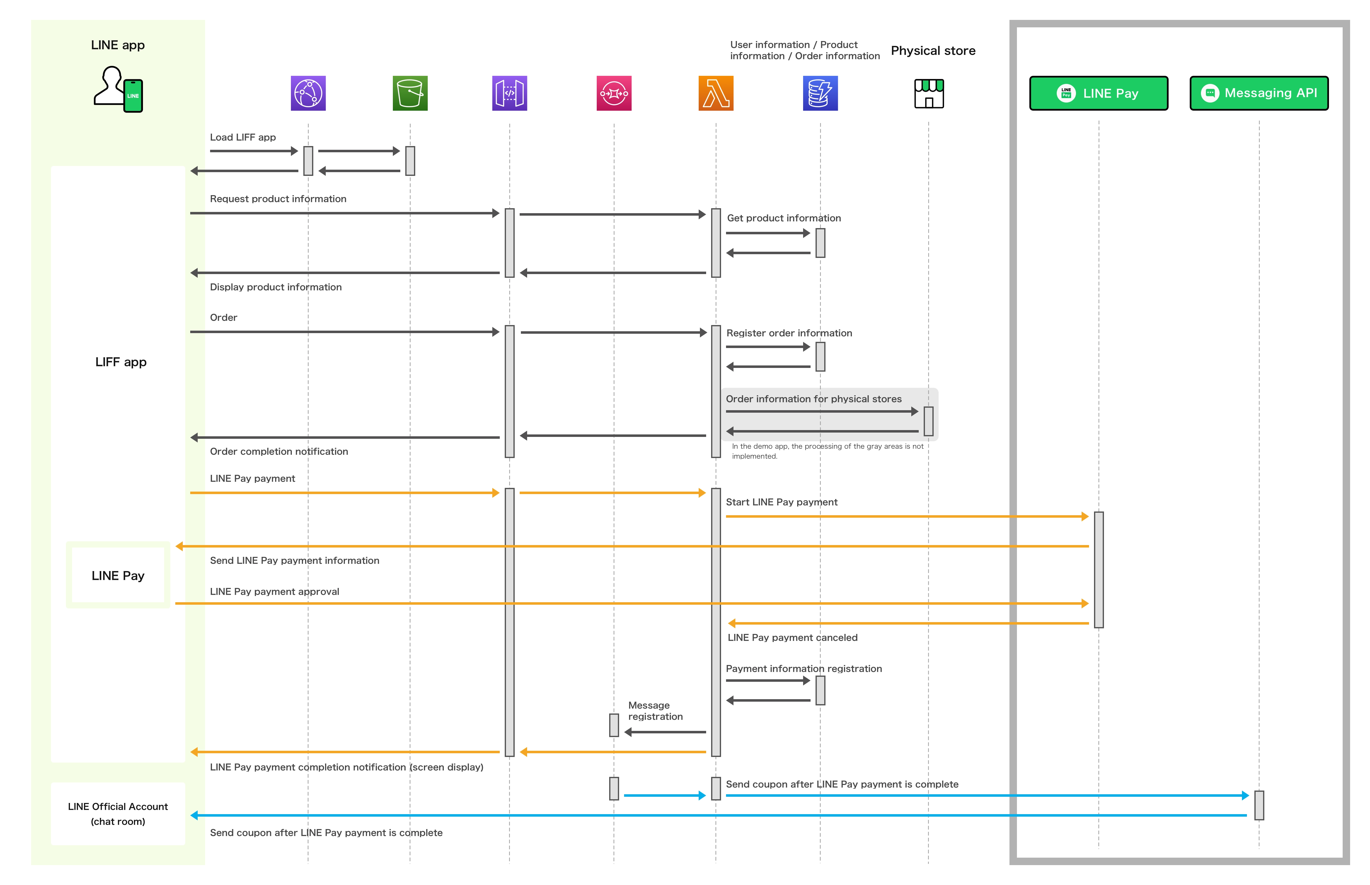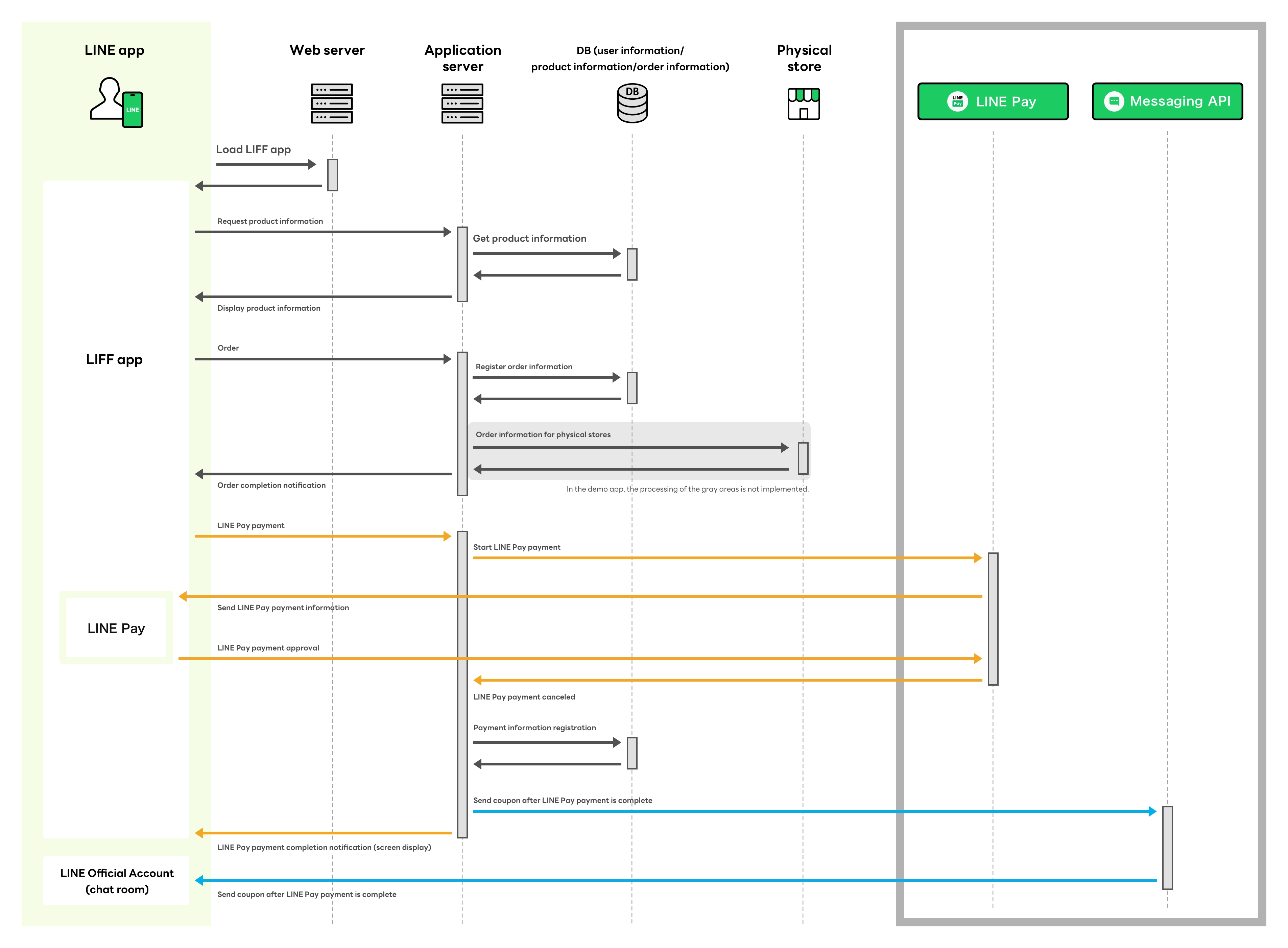 Please note that the demo app will access your LINE account profile information, including your display name and user ID. Your user ID will be stored on the server, but this data will be deleted daily. Payment will be made from the LINE Pay balance prepared by this demo app. No actual payment method is selected or payment is made.