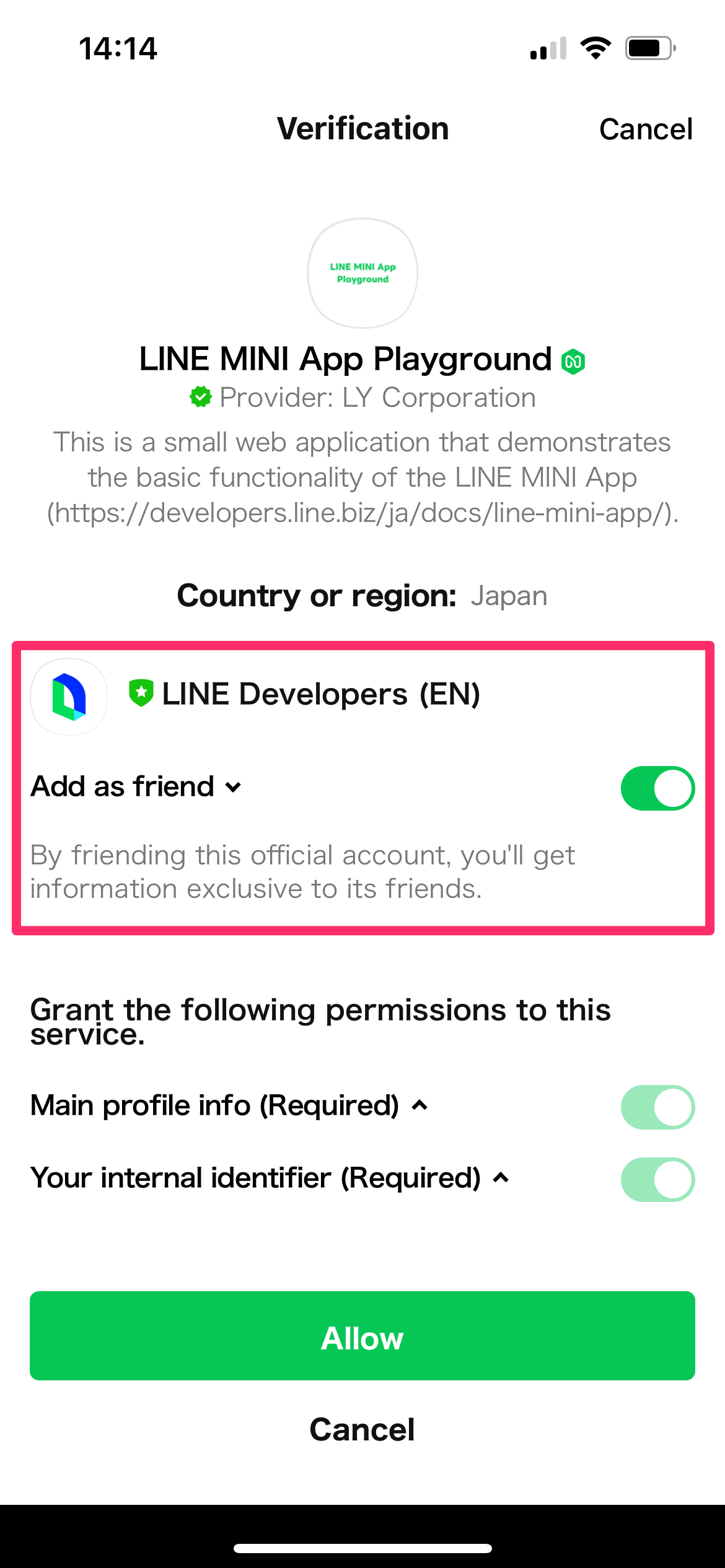However, if only openid is specified in the Scope section of the Web app settings tab in your LINE MINI App channel, enabling the "Channel consent simplification" feature will prevent the verification screen and the channel consent screen from appearing. As a result, you can't prompt users to add friends using the add friend option.