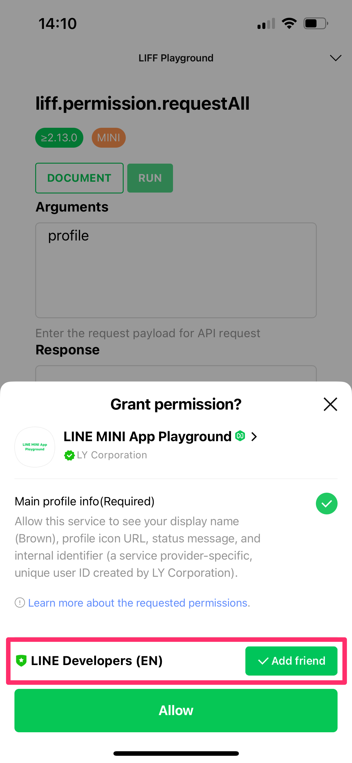 For more information, see liff.permission.query() and liff.permission.requestAll() in the LIFF API reference.