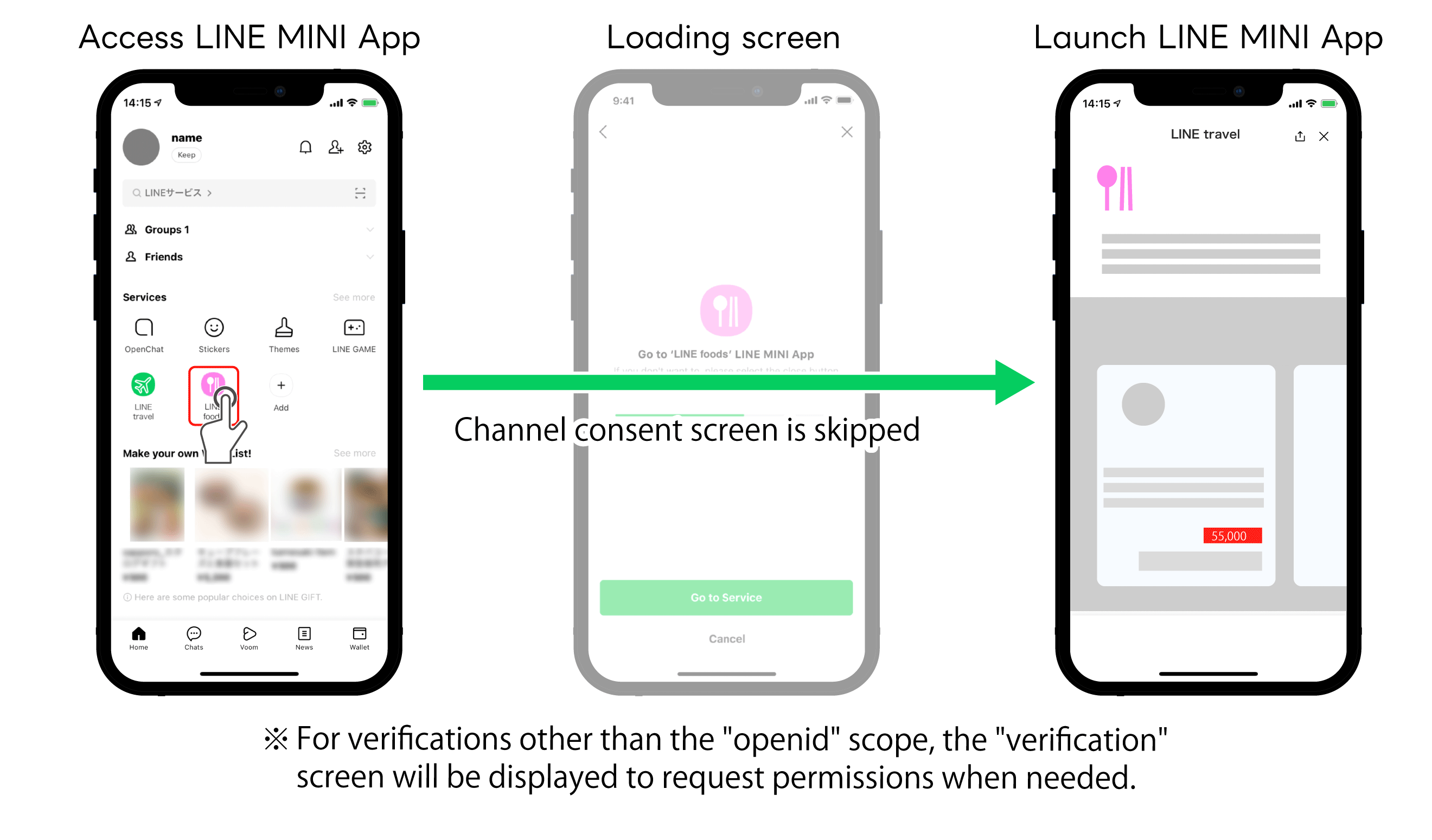 Therefore, if you've designed your LINE MINI App so that immediately after it's launched, it executes requests that require permissions other than the openid scope, such as the liff.getProfile() method, when users access your LINE MINI App, it would appear as if the channel consent screen were displayed without being skipped. We recommend implementing your LINE MINI App so that requests requiring permissions other than the openid scope are executed only when they are actually needed, whenever possible.