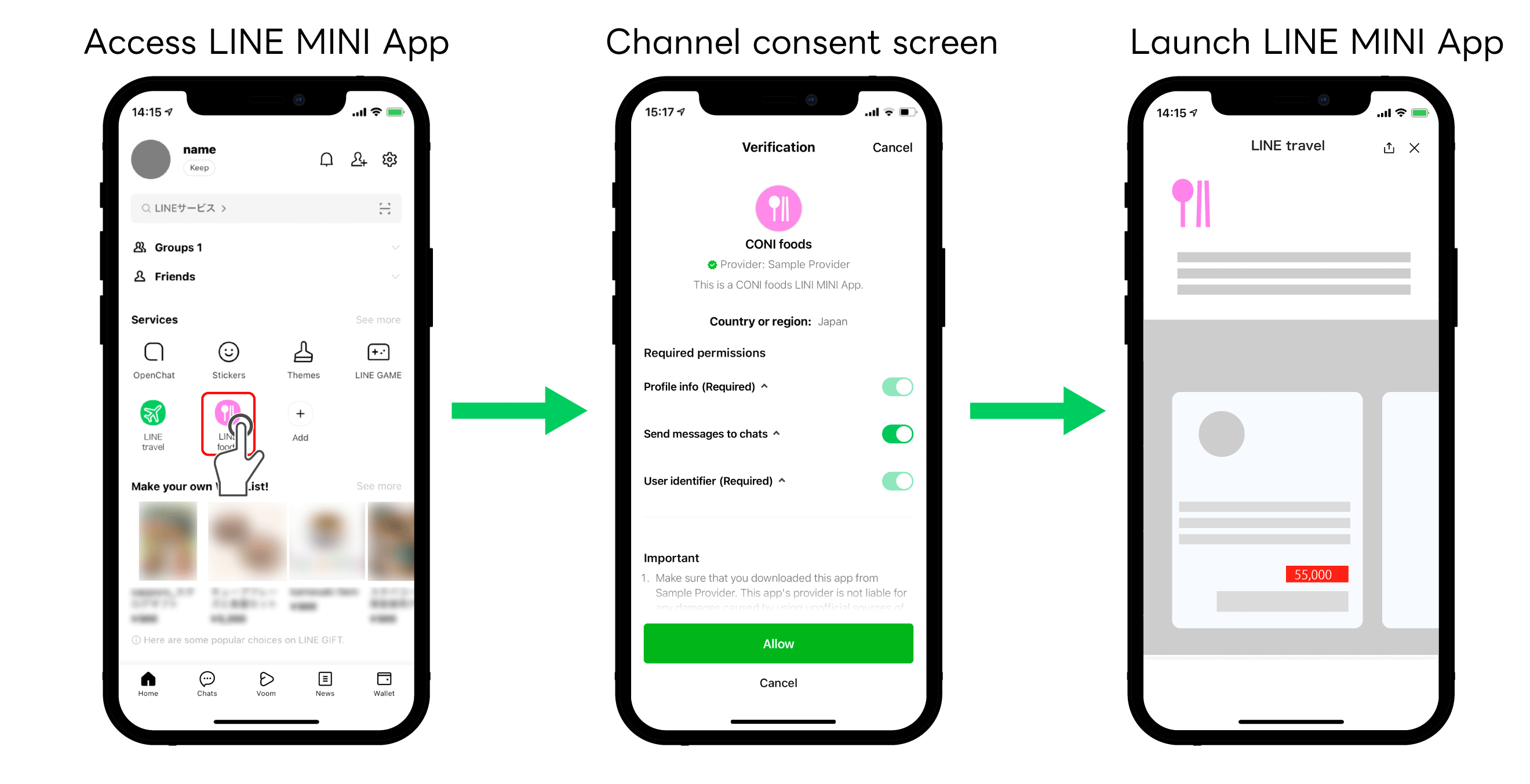 In LINE MINI Apps, with the "Channel consent simplification" feature, users only need to consent to the simplification once. After that, when users access another LINE MINI App for the first time, the channel consent screen is skipped, allowing users to start using the LINE MINI App immediately.