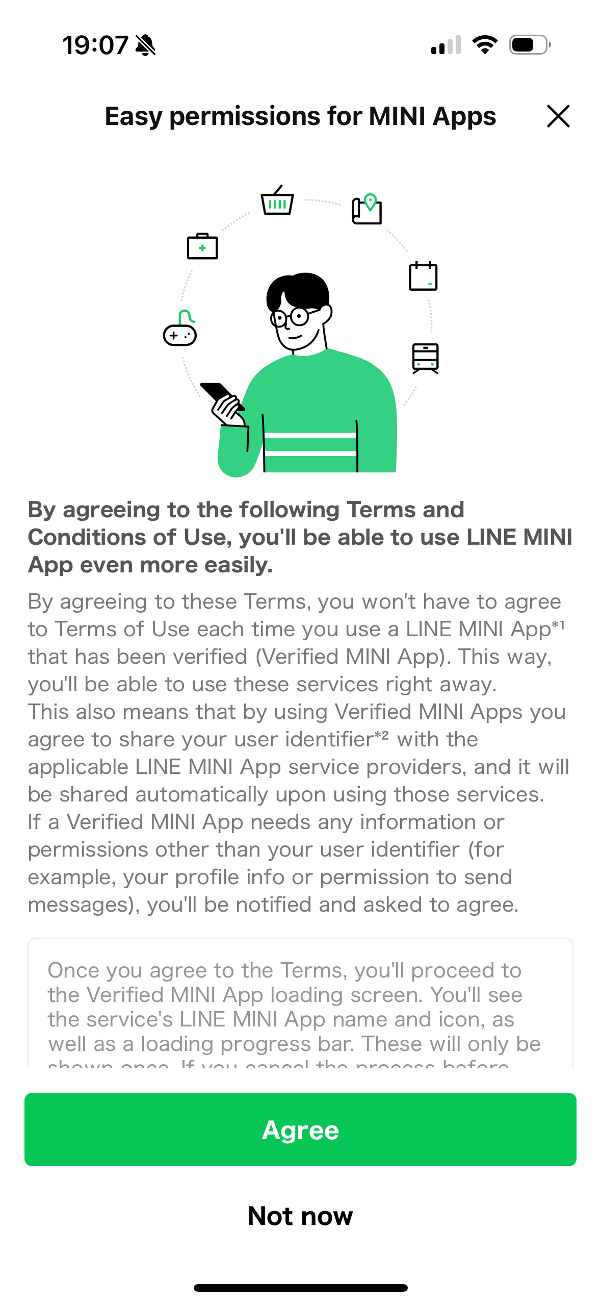 By tapping Agree, users are also considered to have consented to the retrieval of their user ID by other LINE MINI Apps. After that, when users access a LINE MINI App where the "Channel consent simplification" feature is enabled for the first time, the channel consent screen is skipped, allowing them to start using the LINE MINI App immediately.