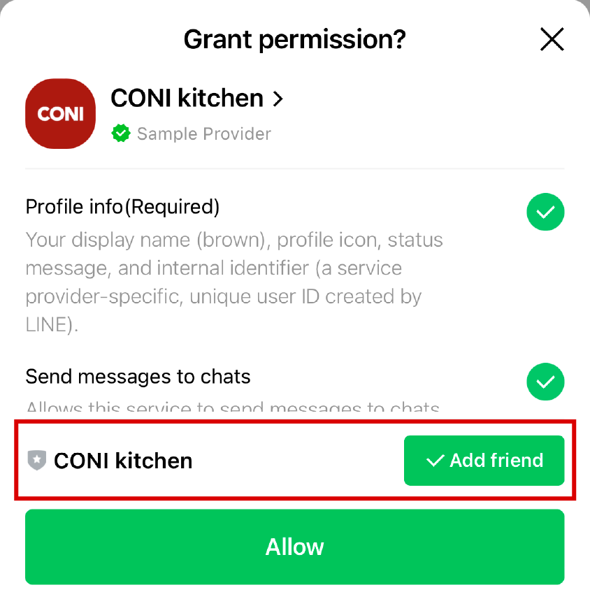 Check the verification for each scope, and click Allow to open the LINE MINI App.Adding friends through the add friend optionThe add friend option will be displayed on the verification screen. However, if only the