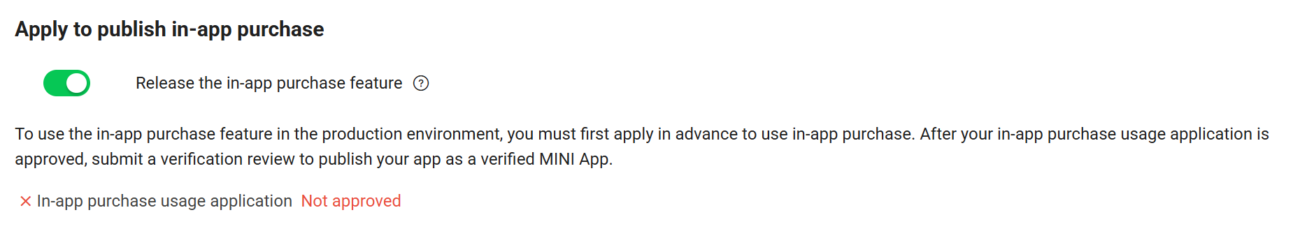 Once your application for in-app purchase has been approved, turn on the Apply to publish in-app purchase toggle button in the Review request tab to submit for review. If your application for in-app purchase is not yet approved, you can't submit for review to become a verified MINI App even if you turn on the toggle button.