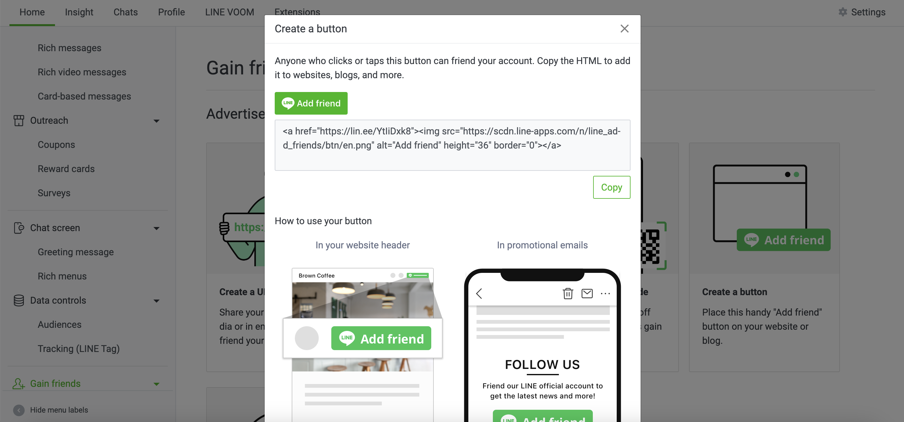 The LINE Official Account Manager generates a piece of code for the Add friend button. Click Home > Gain Friends > "Add friend" tools > Create a button. Copy and paste the HTML code into your website to display the button.