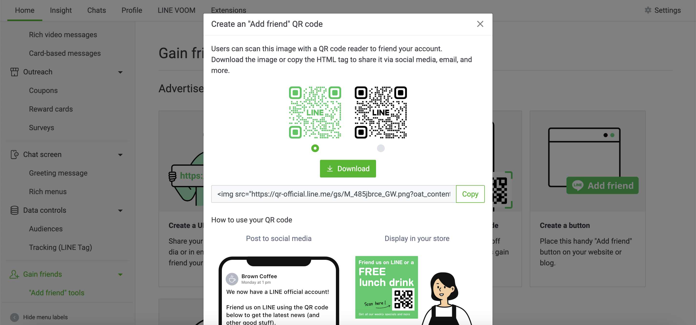 From the LINE Official Account Manager, click Home > Gain friends > "Add friend" tools > Create an "Add friend" QR code. You can copy the HTML snippet and paste the code to your website to display the QR code.