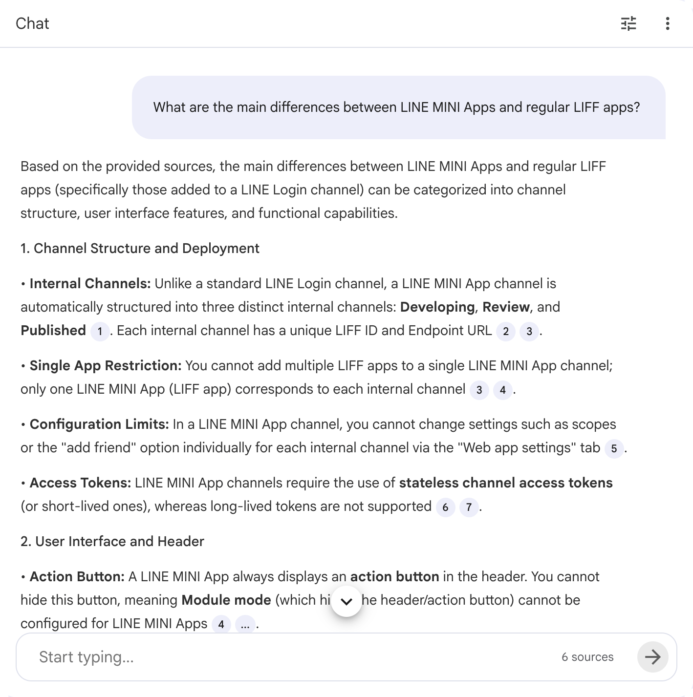 After adding the Markdown files as sources, try asking a question about the LINE MINI App in the "Chat" panel.