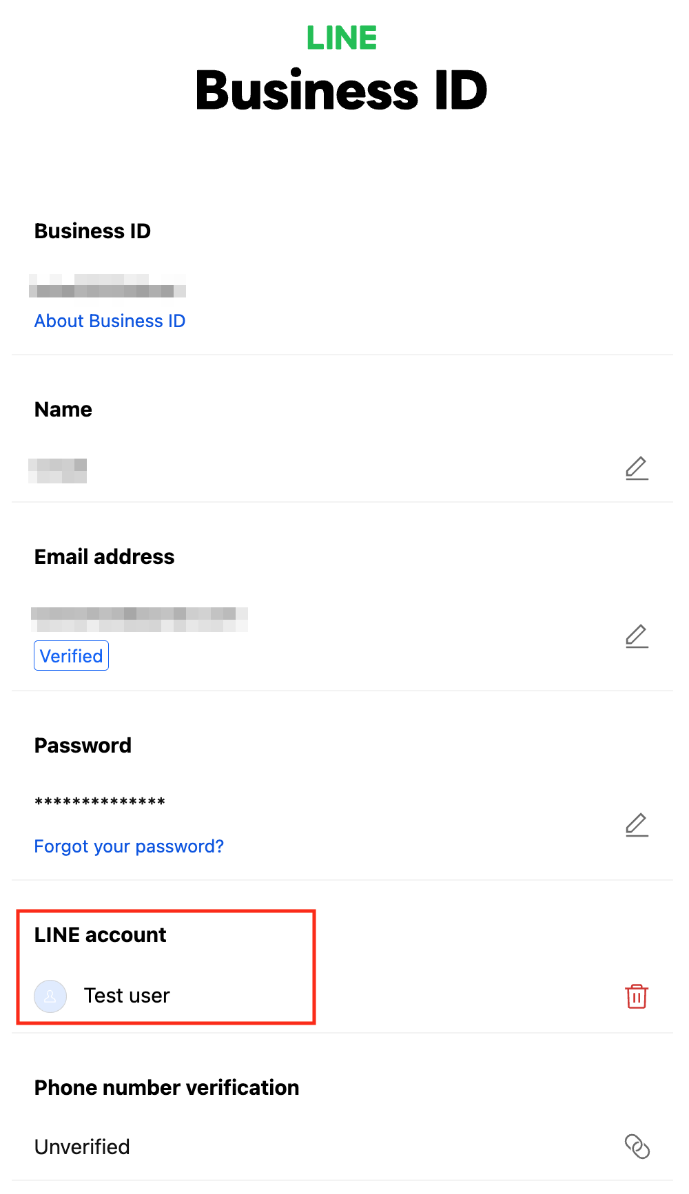 Because the developer account and LINE account are linked through a Business ID, check that the intended LINE account is linked to the Business ID. You can check the link status between a LINE account and a Business ID on the Business ID profile page.