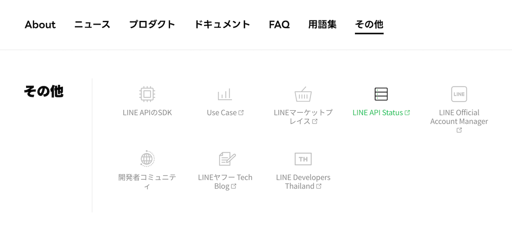 LINE API Statusは、LINE Developersサイトのヘッダーの[その他]や、フッターからアクセスできます。