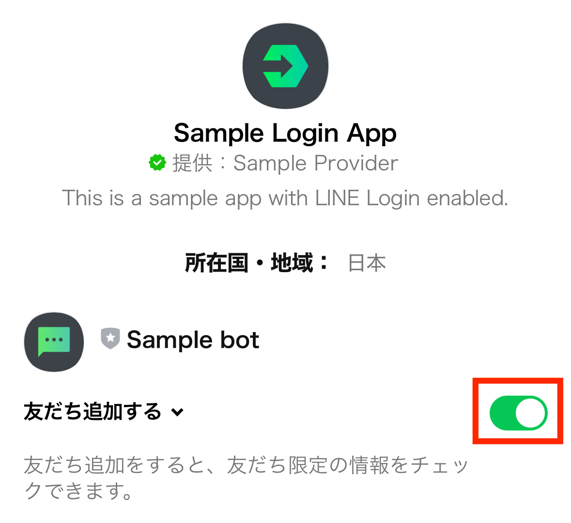 ユーザーがアプリにログインするときに、LINE公式アカウントを友だち追加するオプションを表示するように設定できます。これを、友だち追加オプションと呼びます。友だち追加するLINE公式アカウントは、LINE Developersコンソールで指定します。