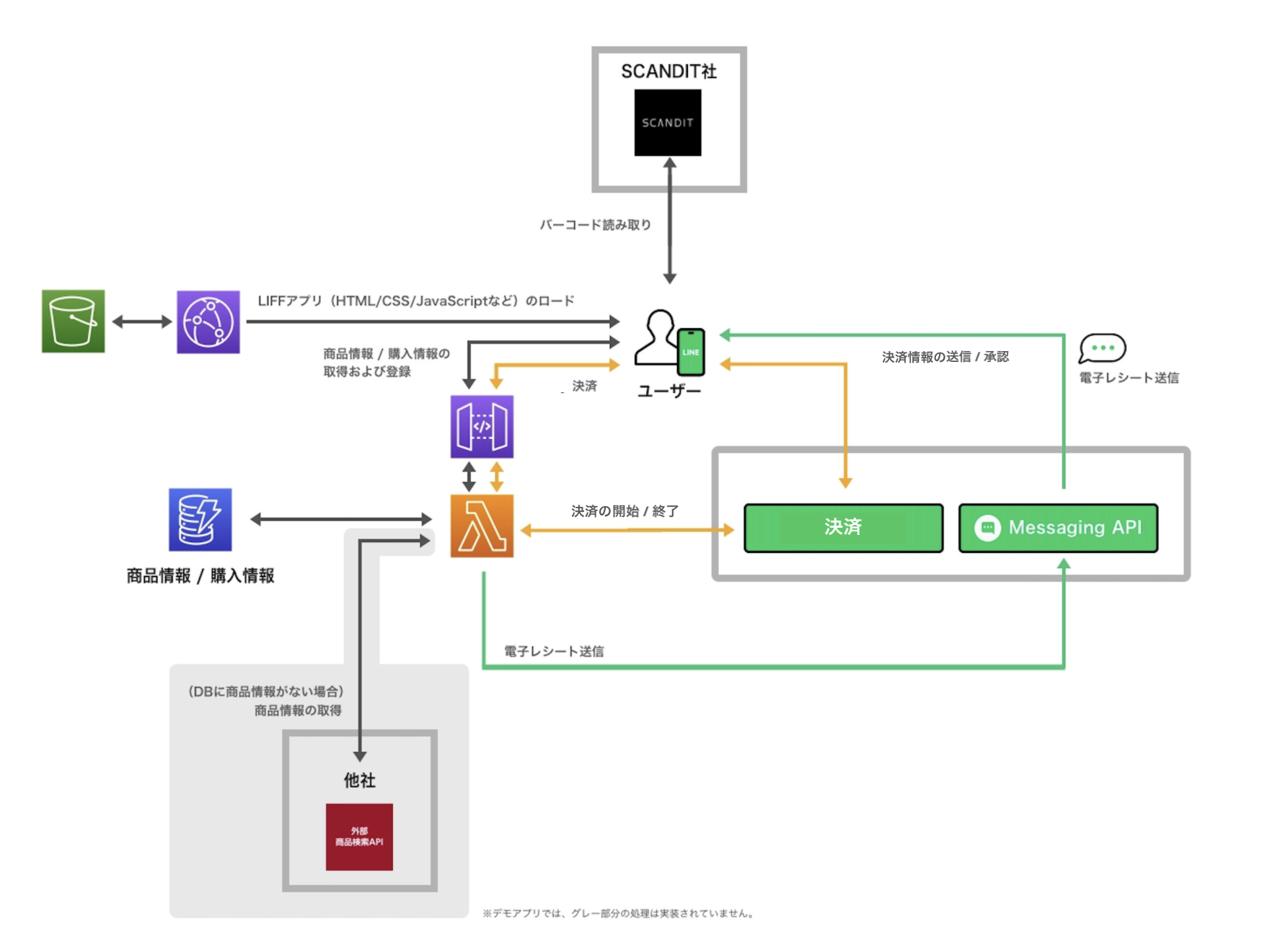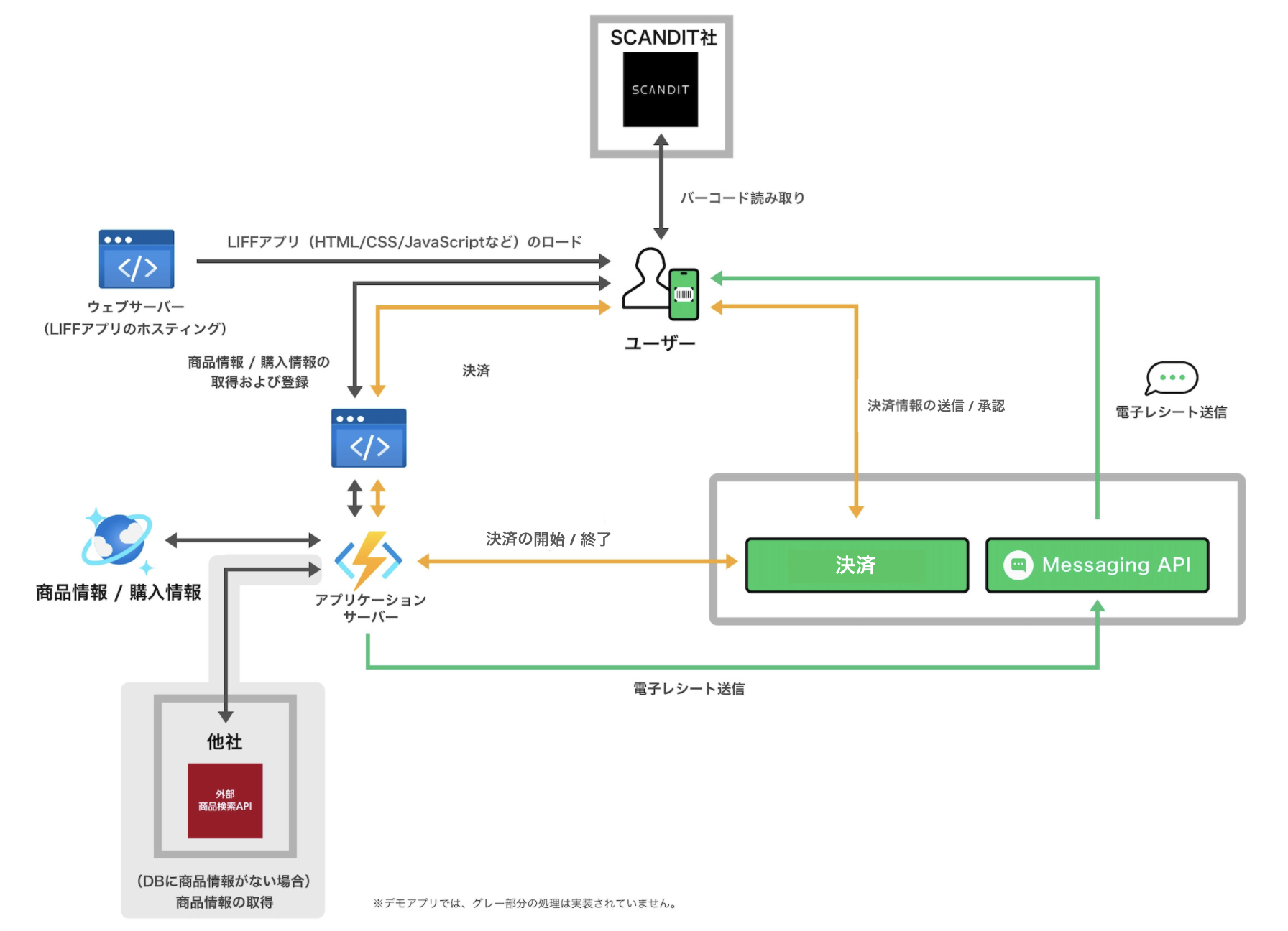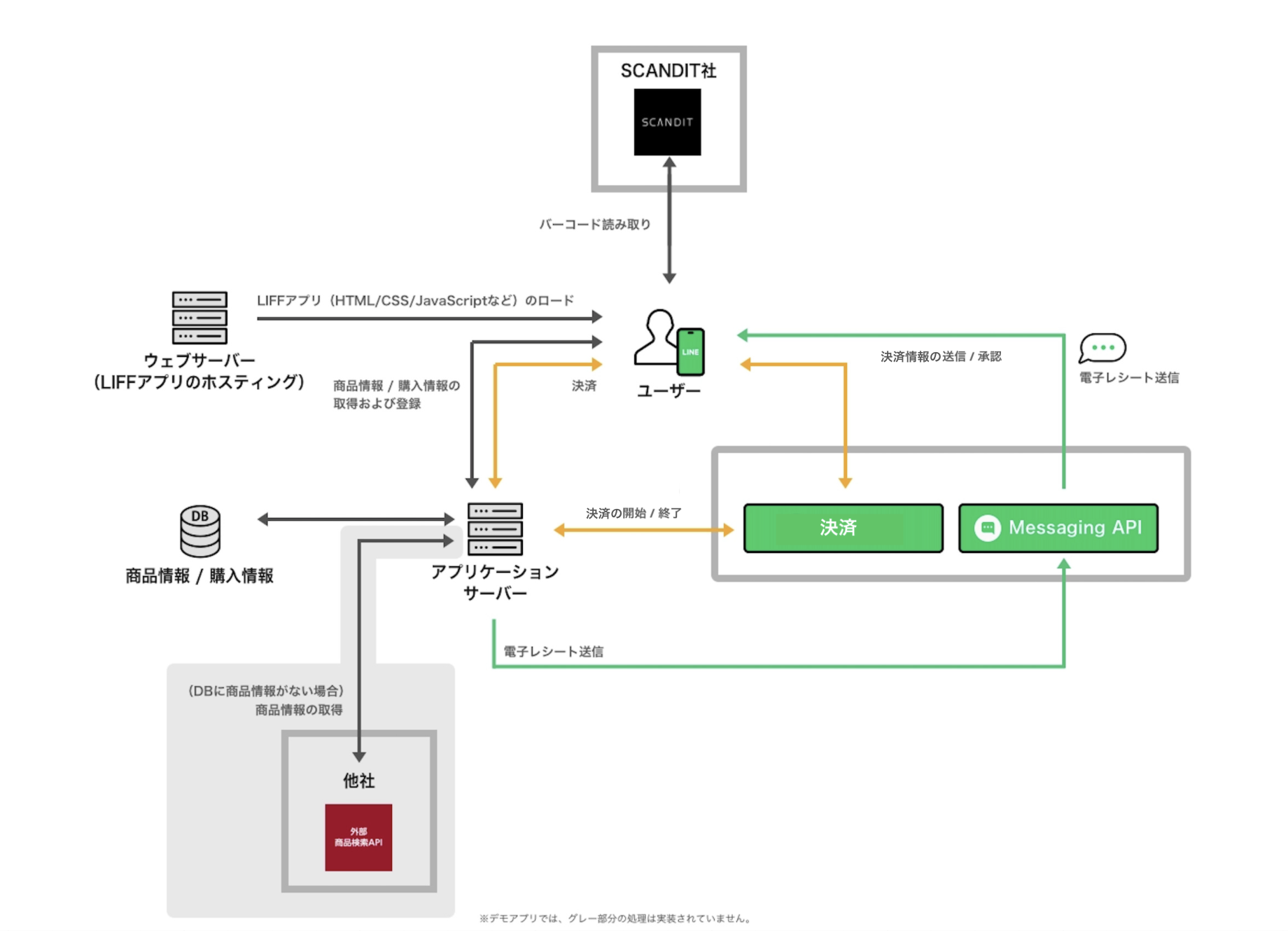 デモアプリケーションで、どのようにLINE APIを利用しているかを示した図です。