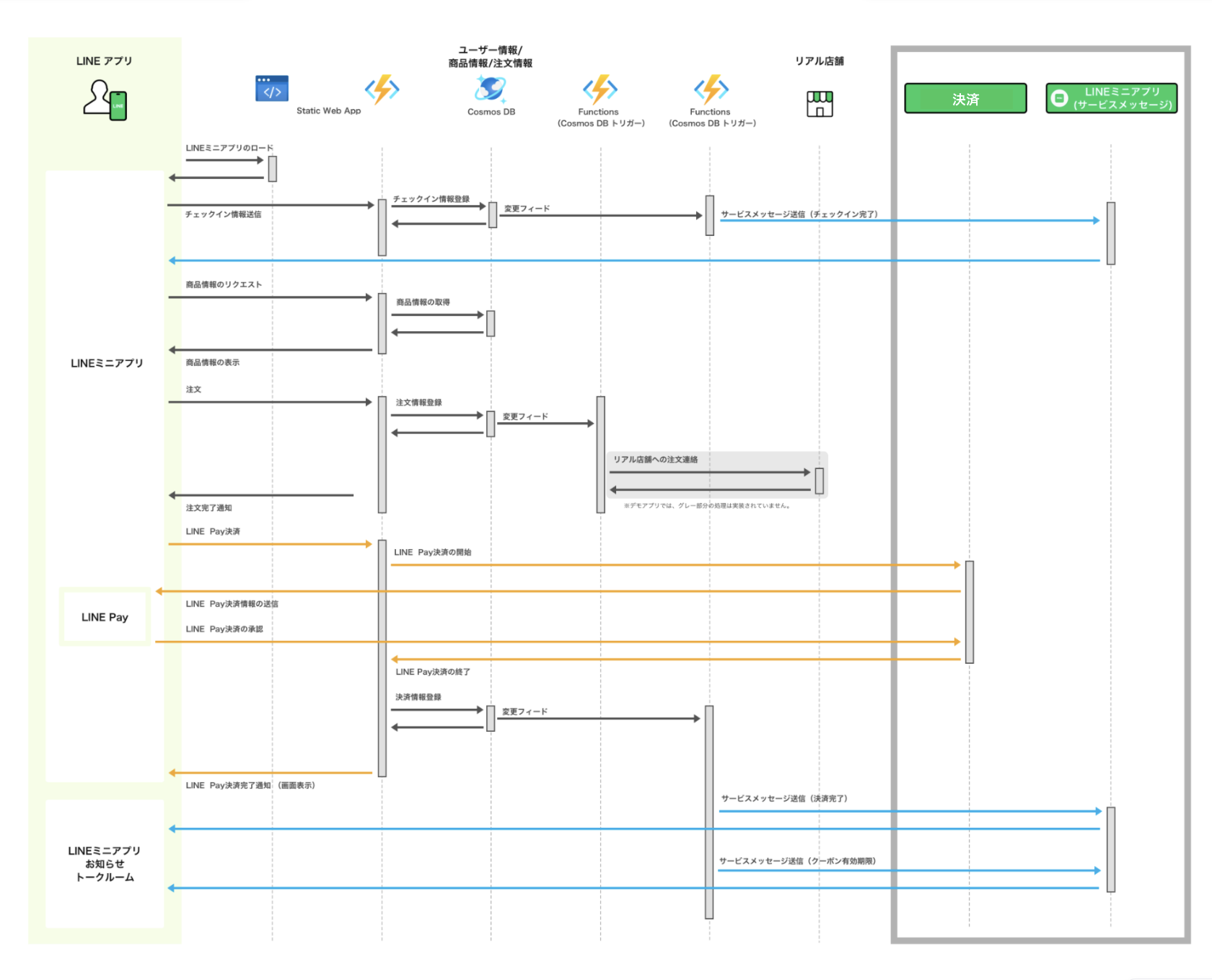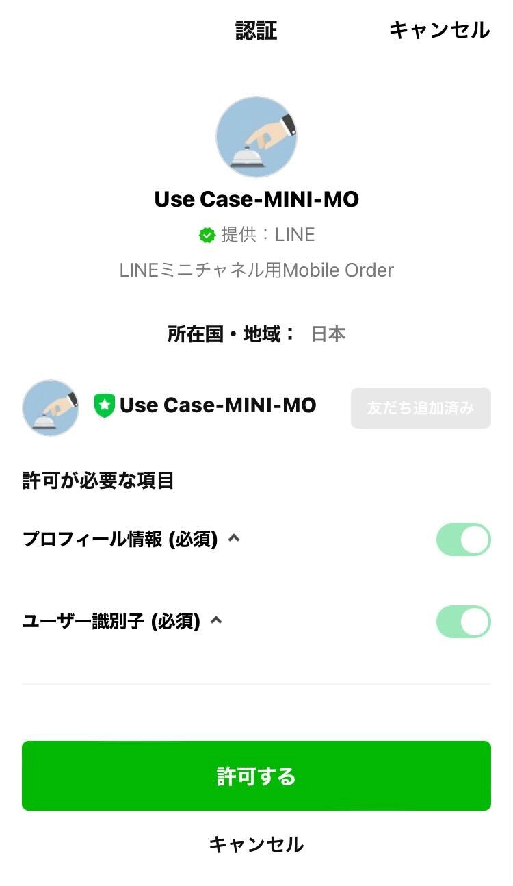デモアプリでは、皆さまのLINEアカウントの「プロフィール情報(表示名、ユーザーID)」を取得します。ユーザーIDのみサーバーに保存しますが、保存したデータは毎日削除されます。上記をご理解のうえ、ご利用ください。本デモアプリが用意したLINE Pay残高から決済が行われます。実際の決済手段の選択および決済は行われません。