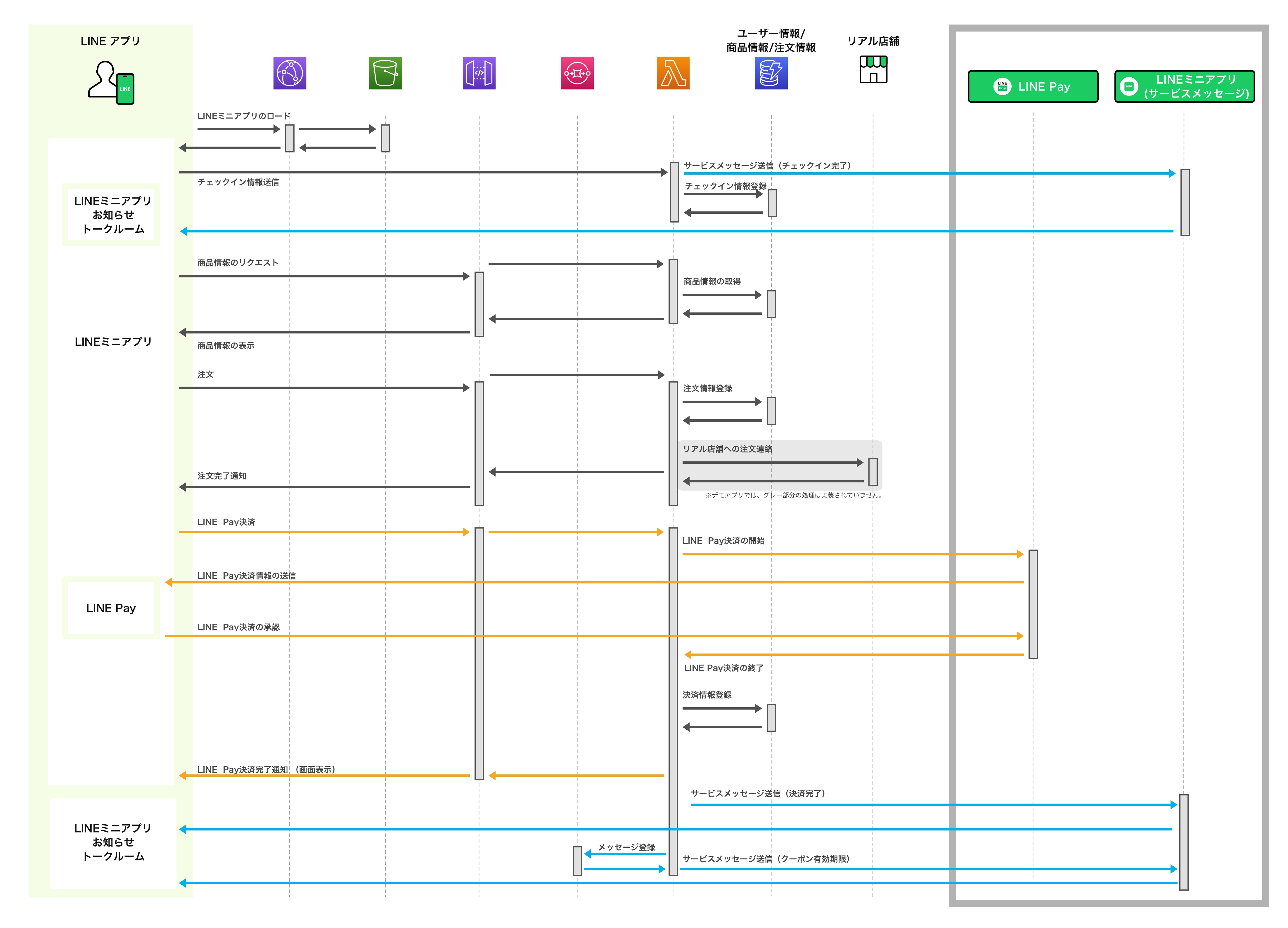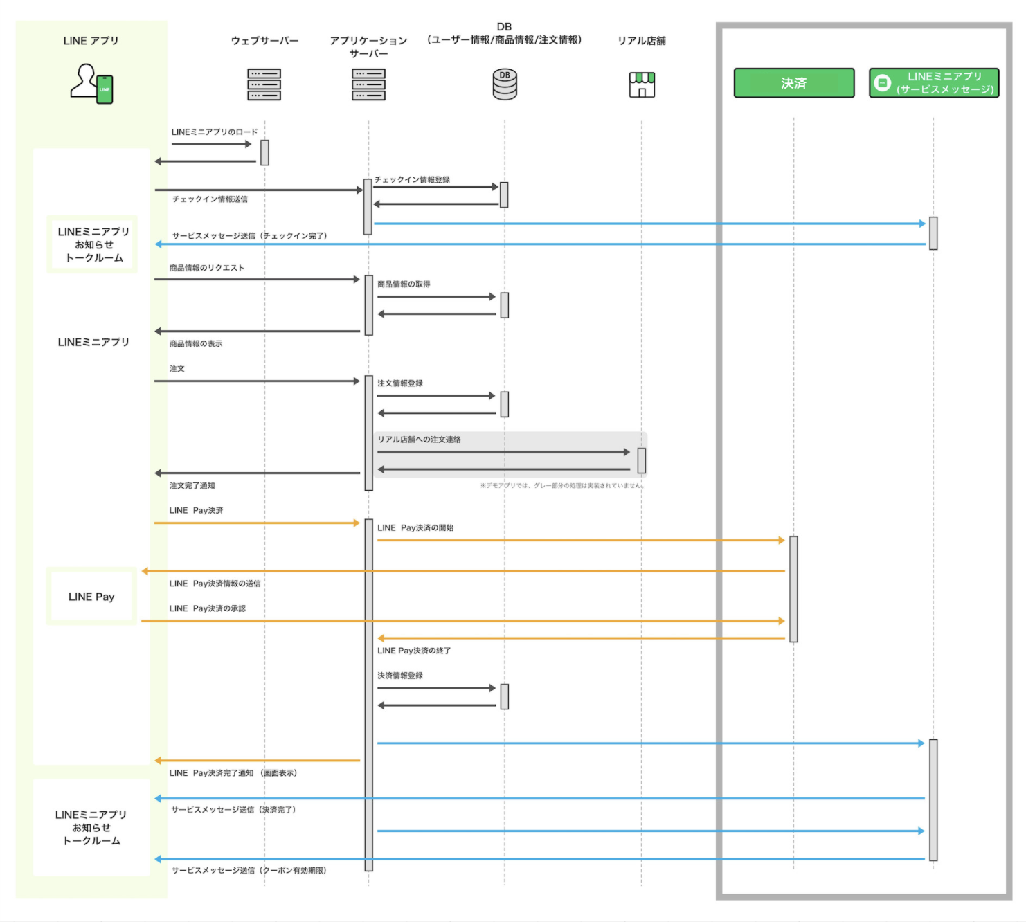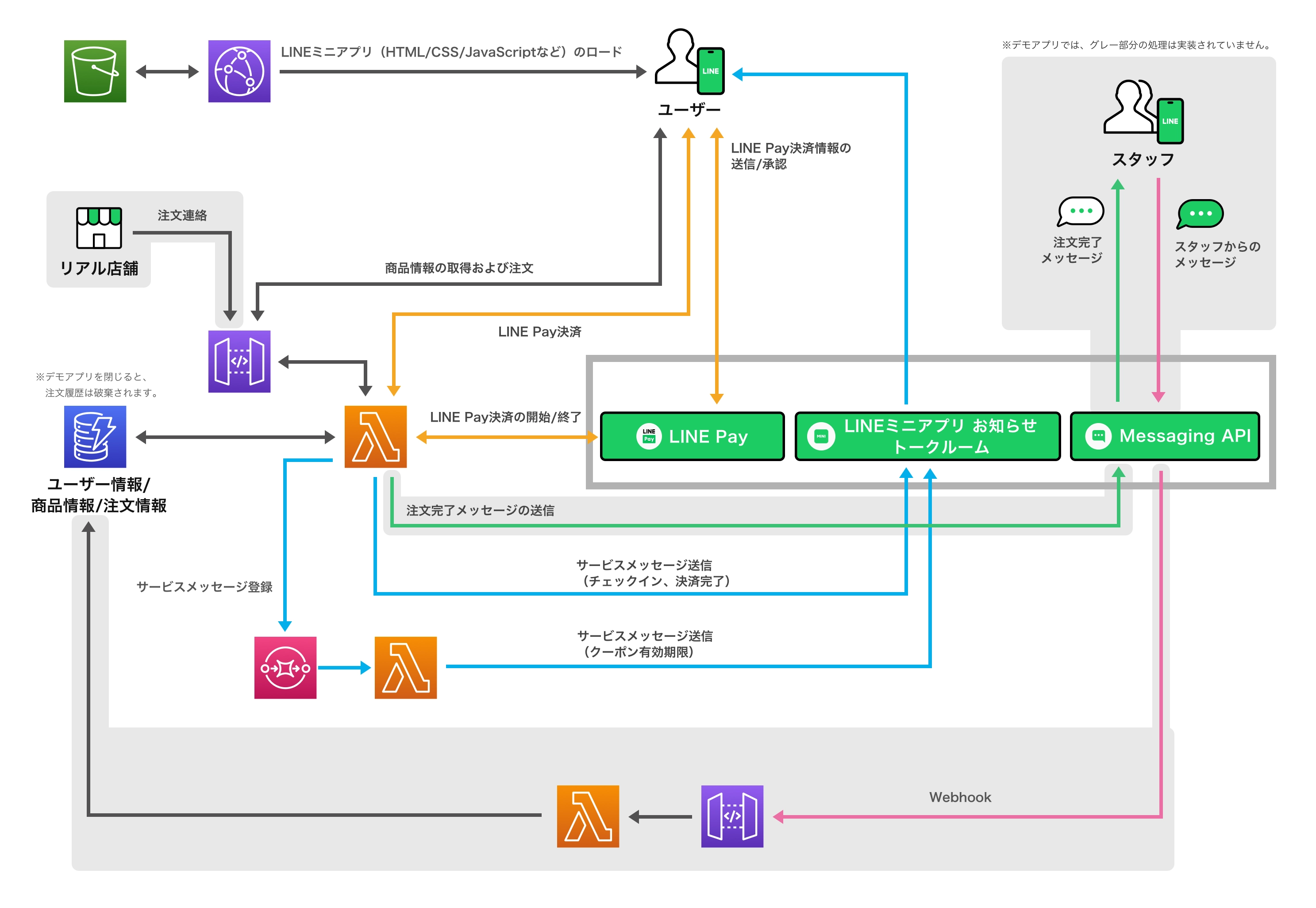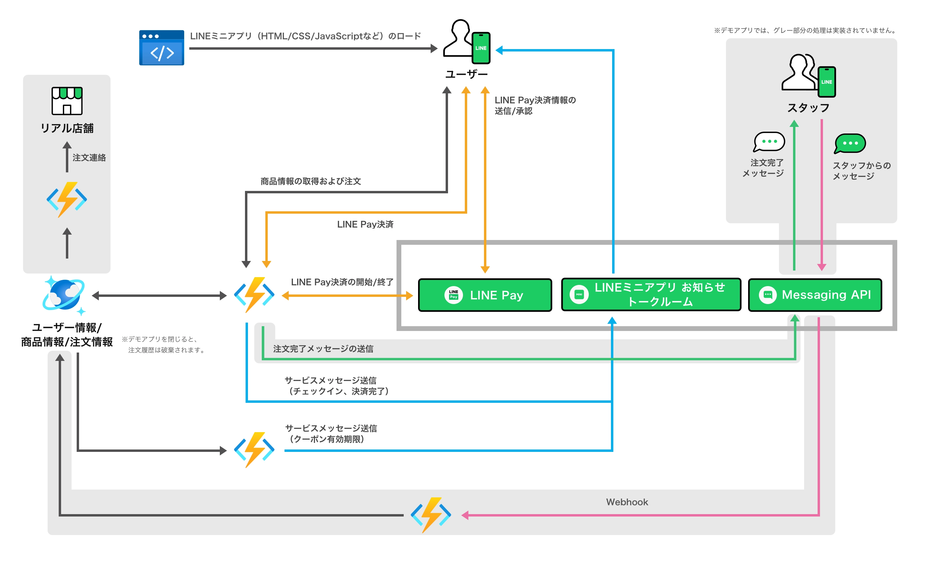デモアプリケーションで、どのようにLINE APIを利用しているかを示した図です。