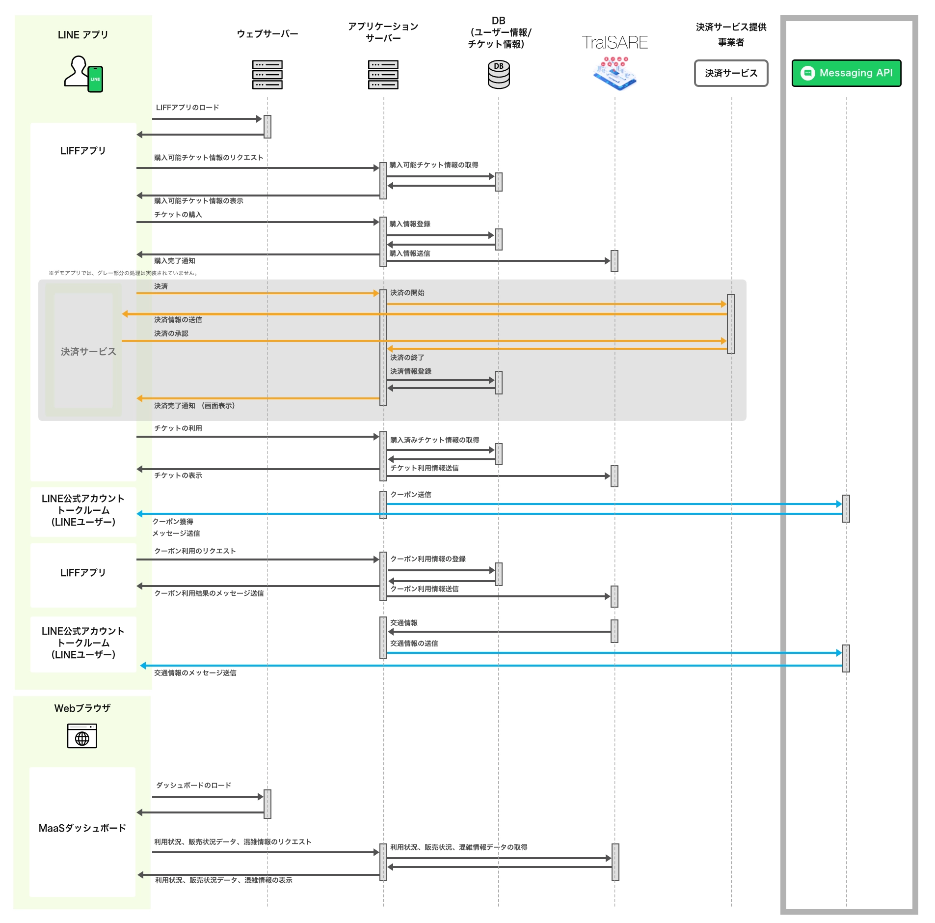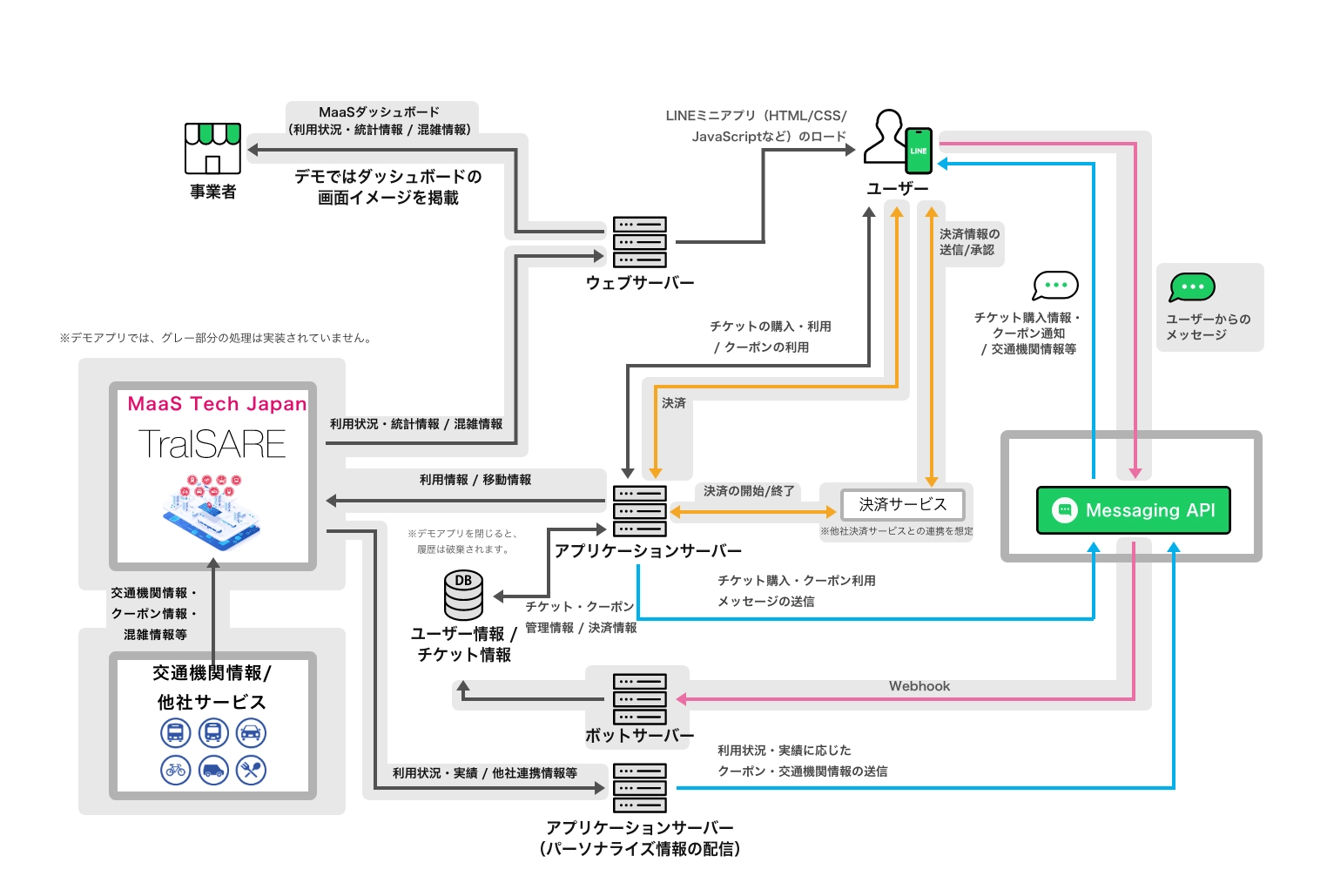 デモアプリケーションで、どのようにLINE APIを利用しているかを示した図です。