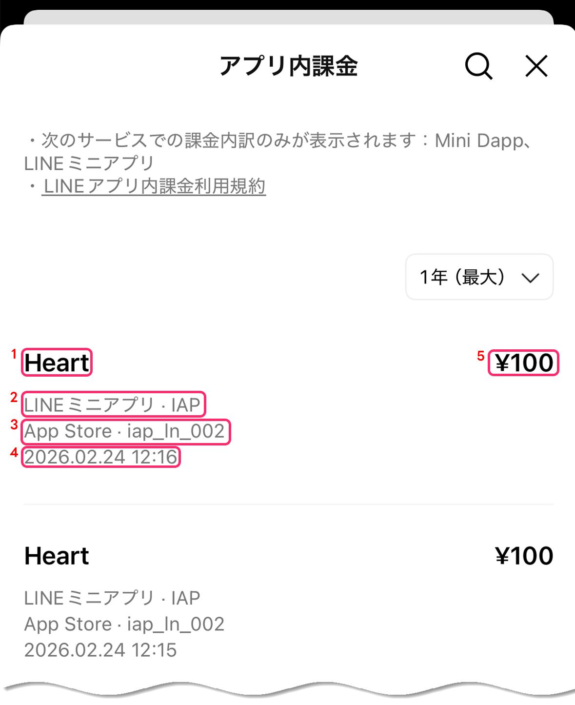 | 4 | 決済時間を表示します。LINEプラットフォームがストアでの決済処理を確認した時刻が表示されます。 |