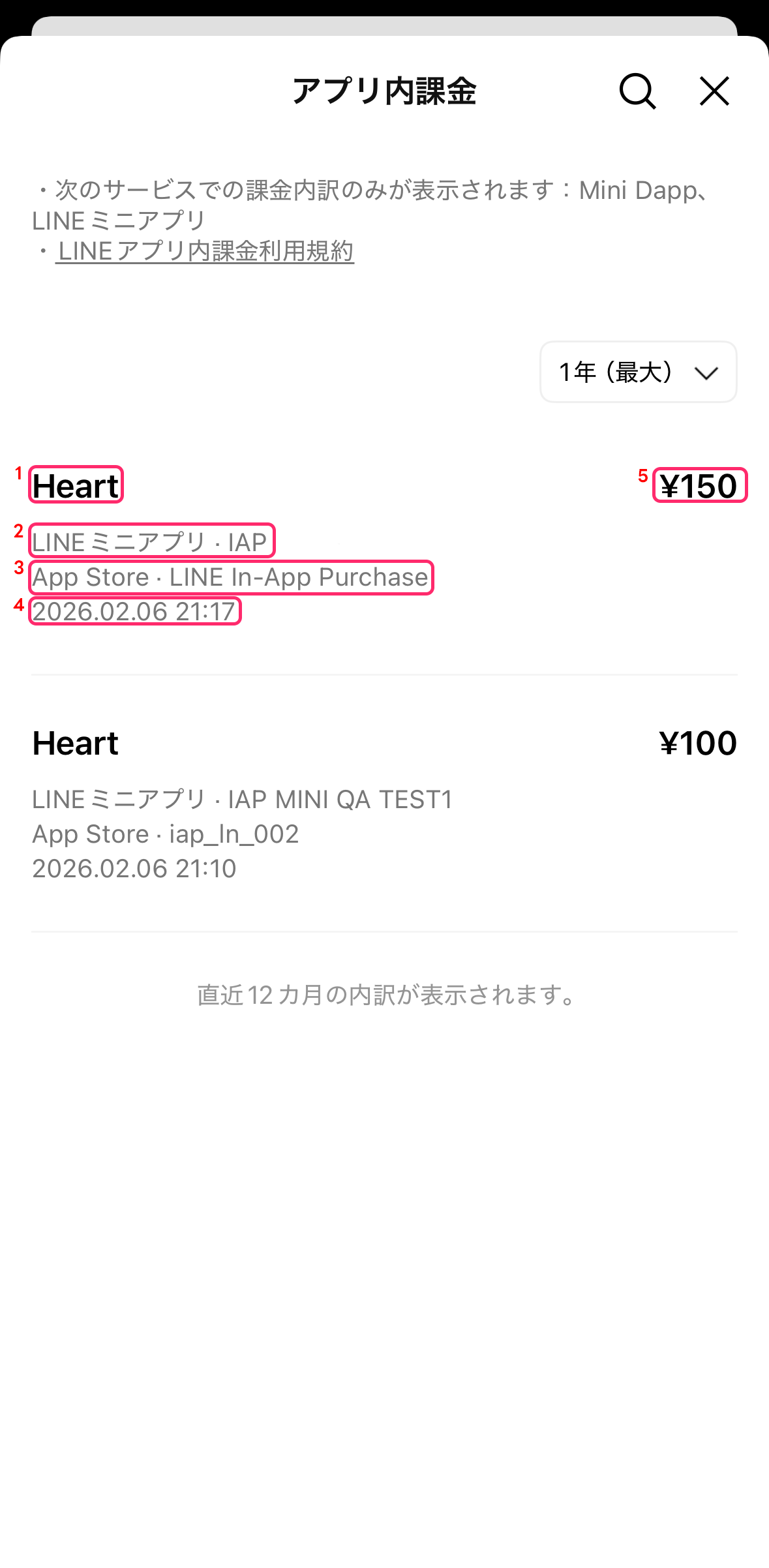 | 4 | 決済時間を表示します。ストアで決済処理された後、LINEプラットフォームで決済処理が確認された時刻が表示されます。 |