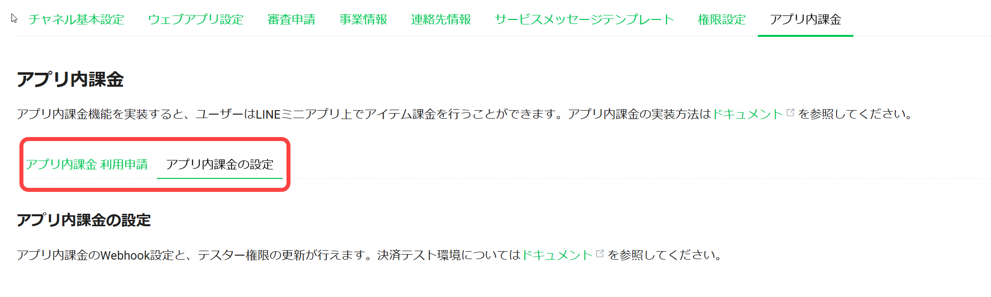 - LINE Developersコンソールの[アプリ内課金]タブを選択し、[アプリ内課金の設定]タブを選択します。