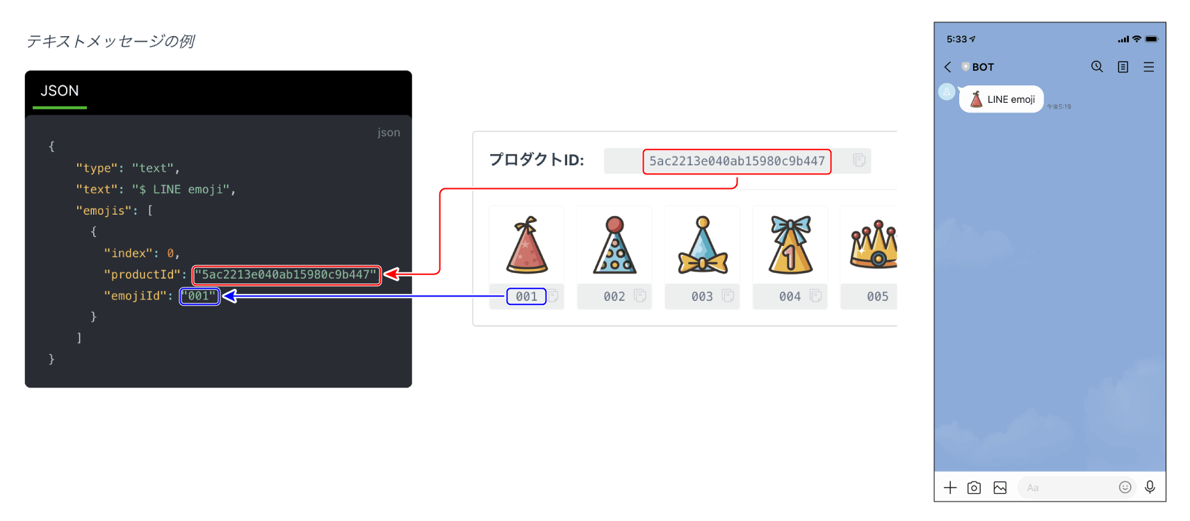 絵文字を送信するには、テキストメッセージオブジェクトやテキストメッセージ(v2)オブジェクトに絵文字のプロダクトIDと絵文字IDを指定します。たとえばテキストメッセージを使用する場合は、下図のようにemojis.productId