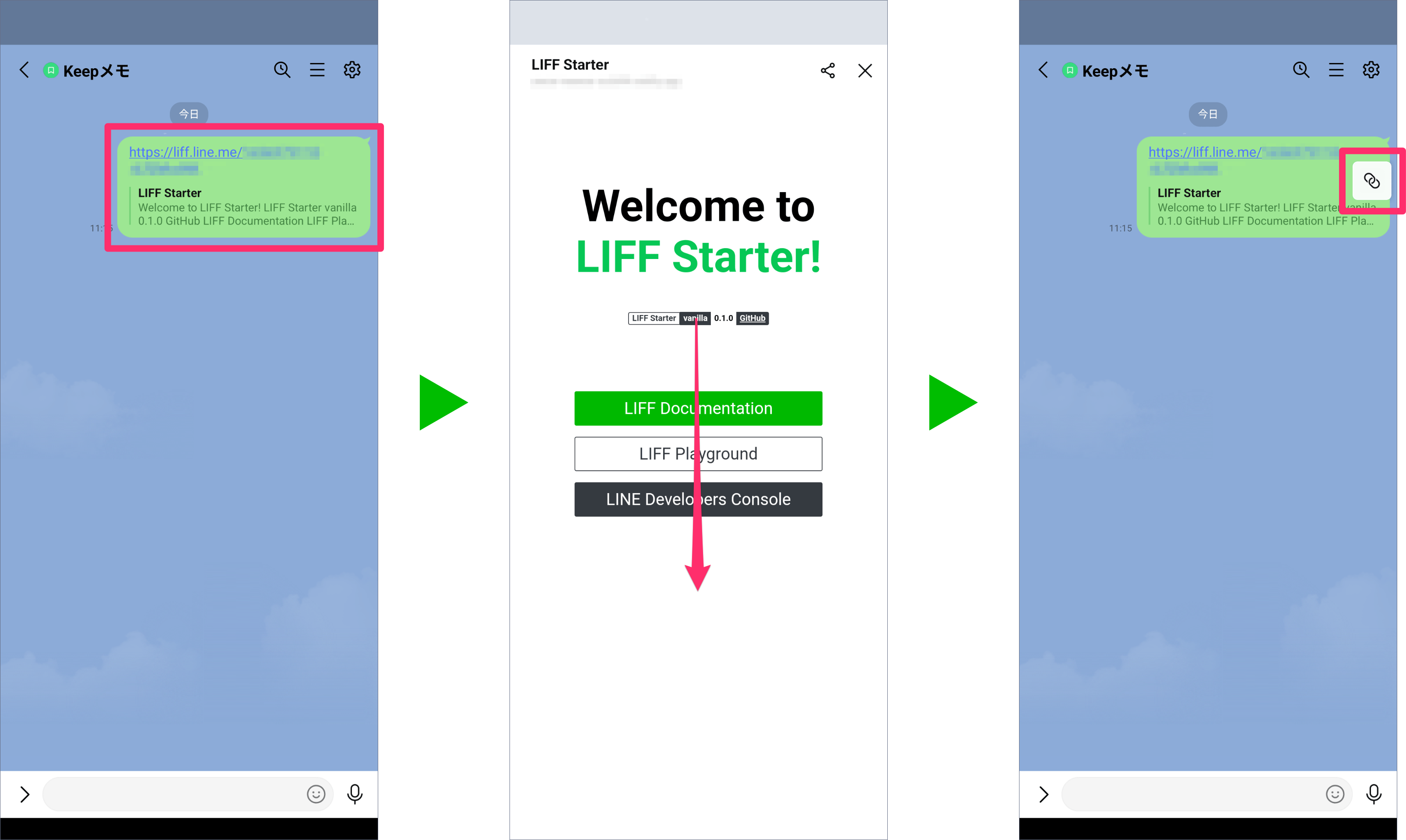 LIFF URLにアクセスした際の動作について詳しくは、『LIFFドキュメント』の「LIFF URLにアクセスしてからLIFFアプリが開くまでの動作について」を参照してください。
