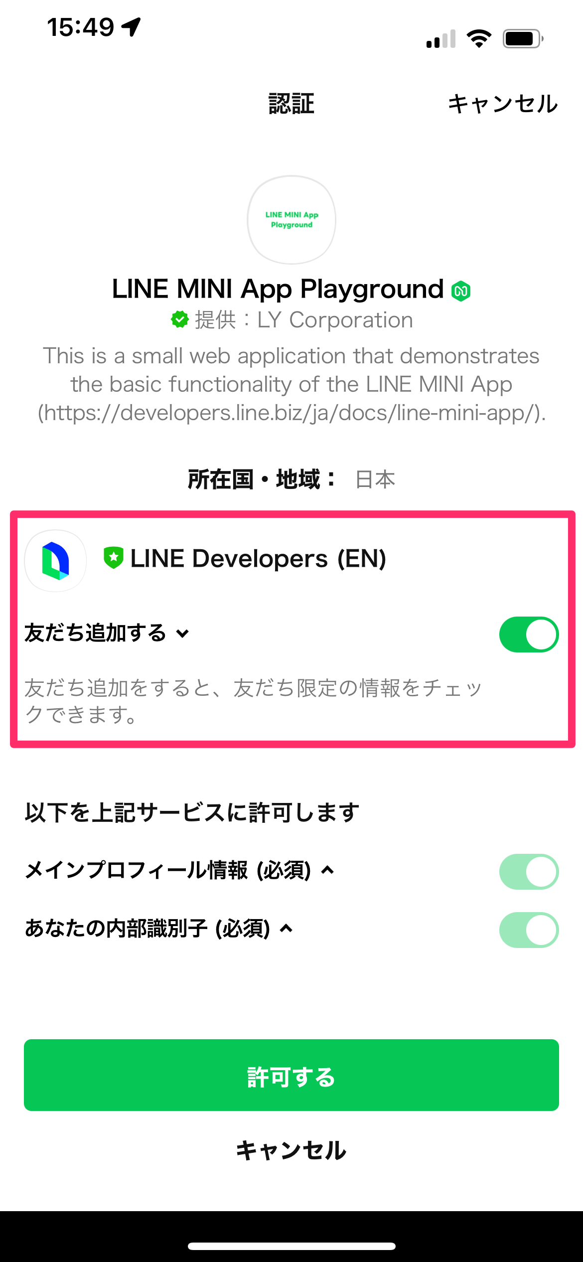 LINEミニアプリでは、友だち追加オプションを使って、アクセス許可要求画面、もしくはチャネル同意画面からLINE公式アカウントの友だち追加への誘導ができます。