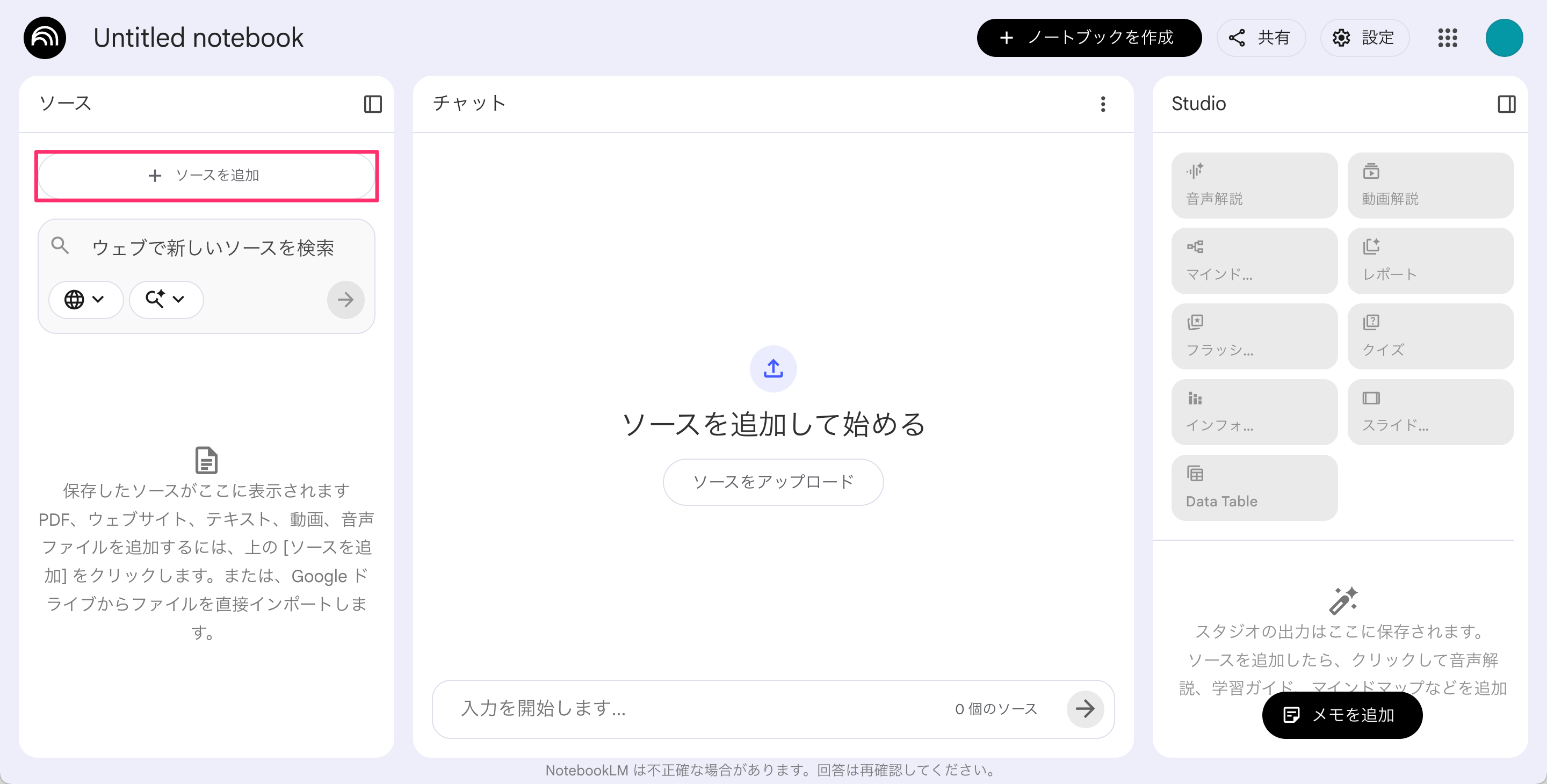 作成したノートブックのソースにMarkdownファイルを追加します。「ソース」パネルの[ソースを追加]ボタンを押し、Markdownファイルをアップロードします。