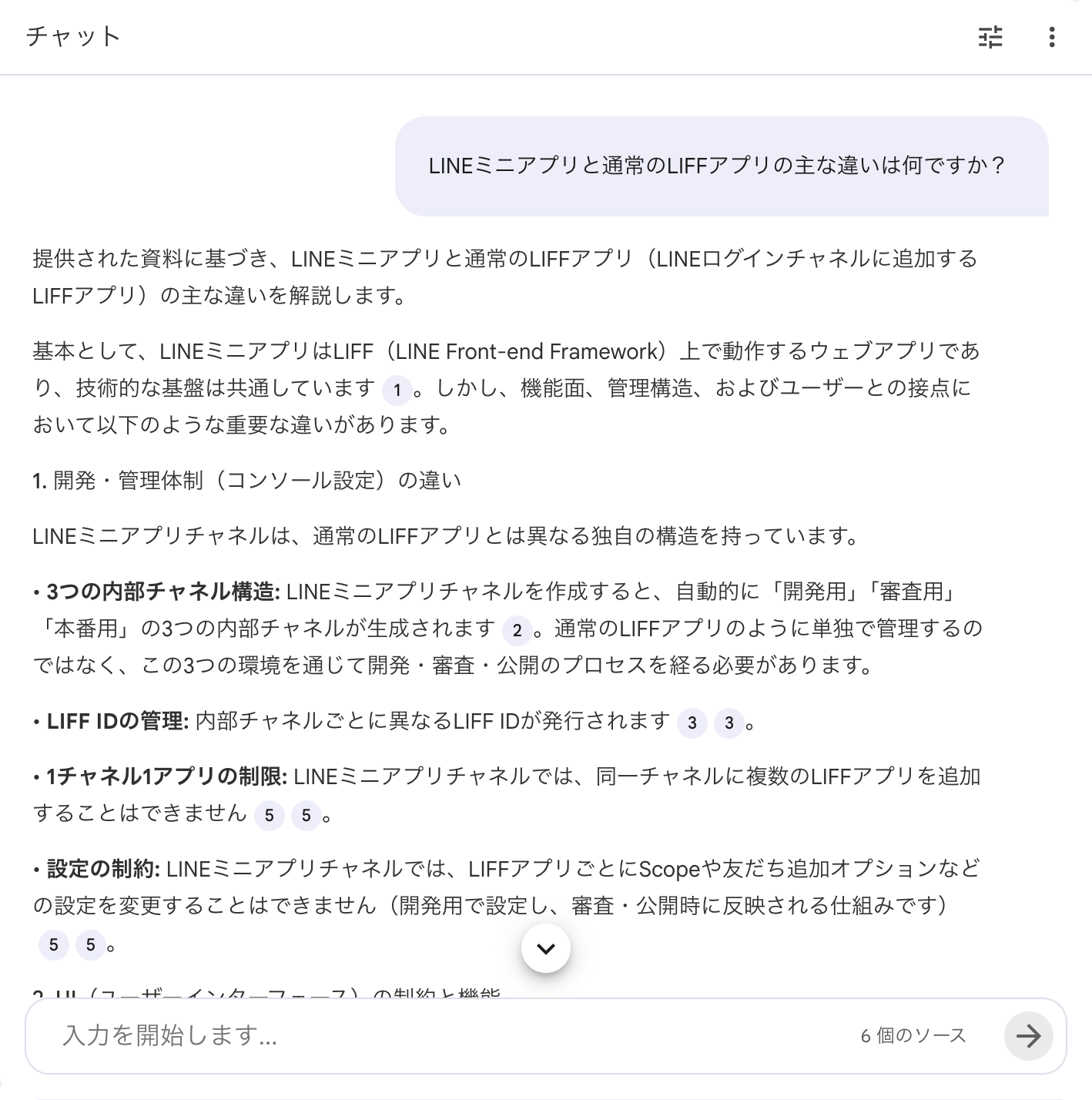たとえば、「LINEミニアプリと通常のLIFFアプリの主な違いは何ですか?」と質問すると、ソースとして追加されたLINEミニアプリのドキュメントに基づき、回答が生成されます。
