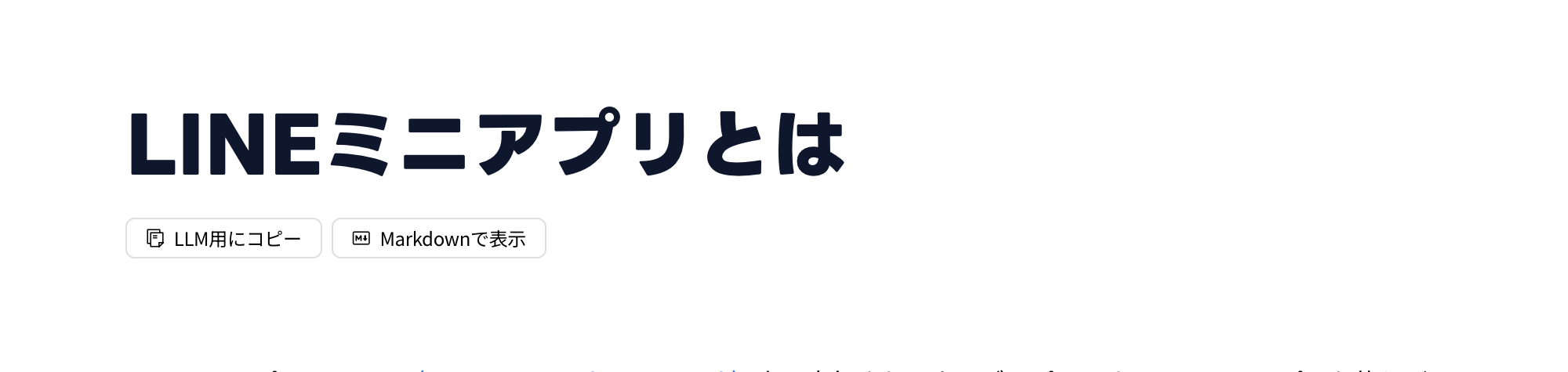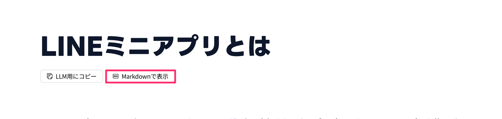 Markdown表示機能に対応しているページでは、ページタイトル下に[LLM用にコピー]ボタンと[Markdownで表示]ボタンが表示されます。これらのボタンを押すことで、そのページの内容をMarkdown形式で取得または表示できます。