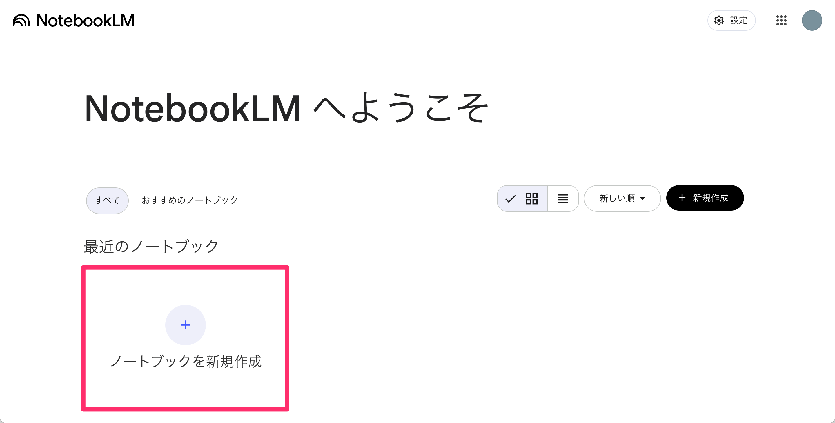 NotebookLMにアクセスし、[ノートブックを新規作成]ボタンを押します。